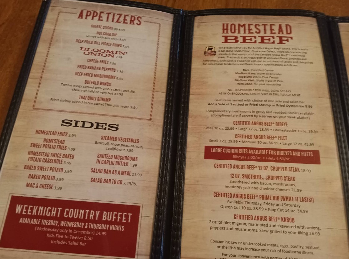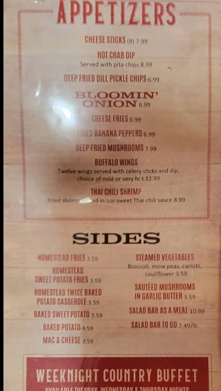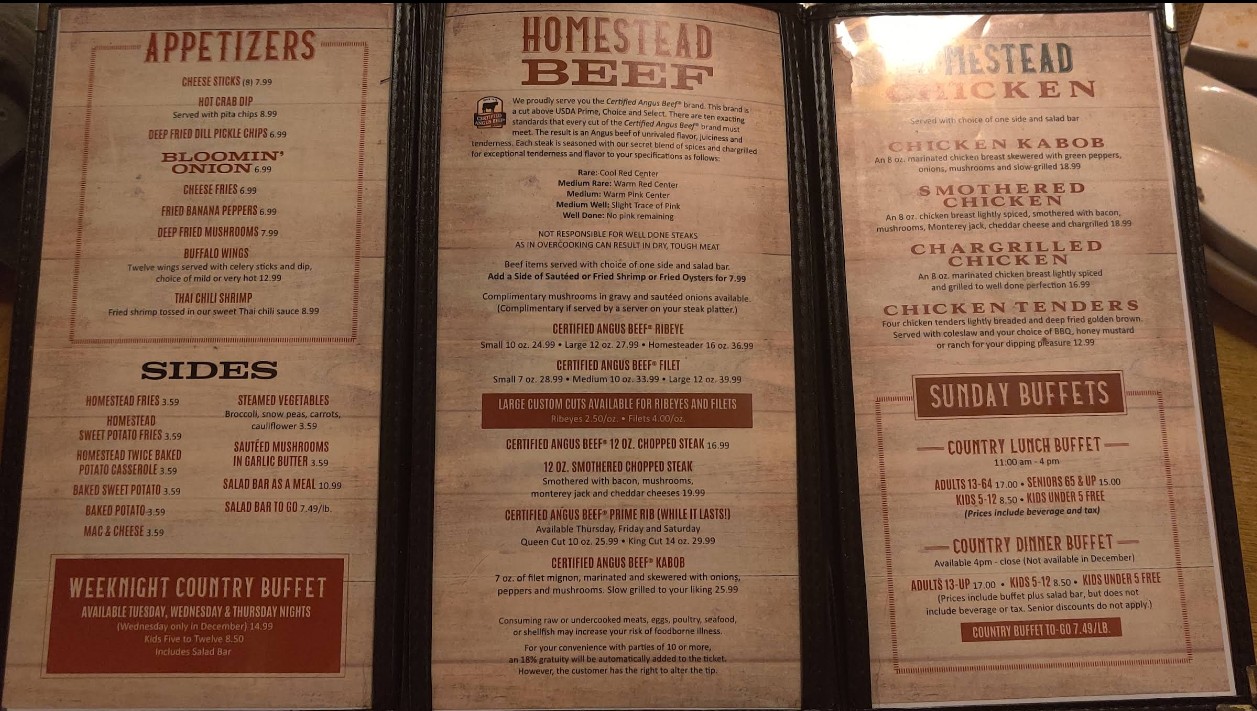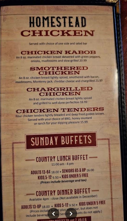Welcome to Homestead Steakhouse & Restaurant, a rustic dining destination known for its hearty portions and classic steakhouse experience. The Homestead Steakhouse & Restaurant menu features premium cuts of steak, tender prime rib, fresh seafood, and a well-loved salad bar that complements every meal. Guests can enjoy a warm, barn-style atmosphere while indulging in expertly prepared dishes made with quality ingredients. Whether you're visiting for a family dinner, special occasion, or a satisfying steakhouse meal, Homestead offers a timeless menu that delivers both flavor and comfort.